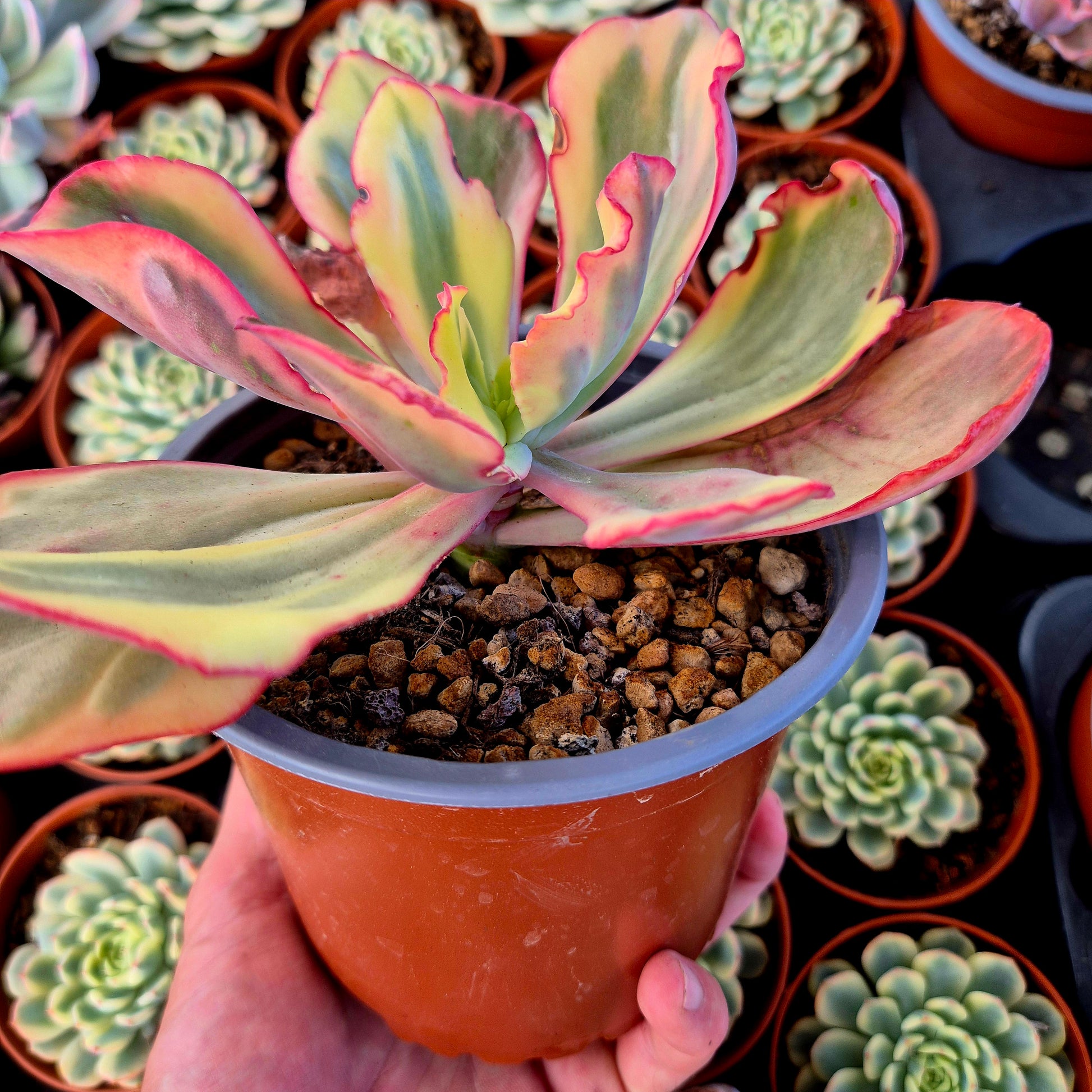 La Echeveria 'Flamingo' variegada Híbrido de E. gibbiflora de porte grande, con rosetas amplias y hojas carnosas de bordes ondulados. Presenta una gama de colores que incluye amarillo, rosa, rojo y verde, con variaciones según la luz y el estrés. Su crecimiento es vigoroso y su presencia es muy ornamental.