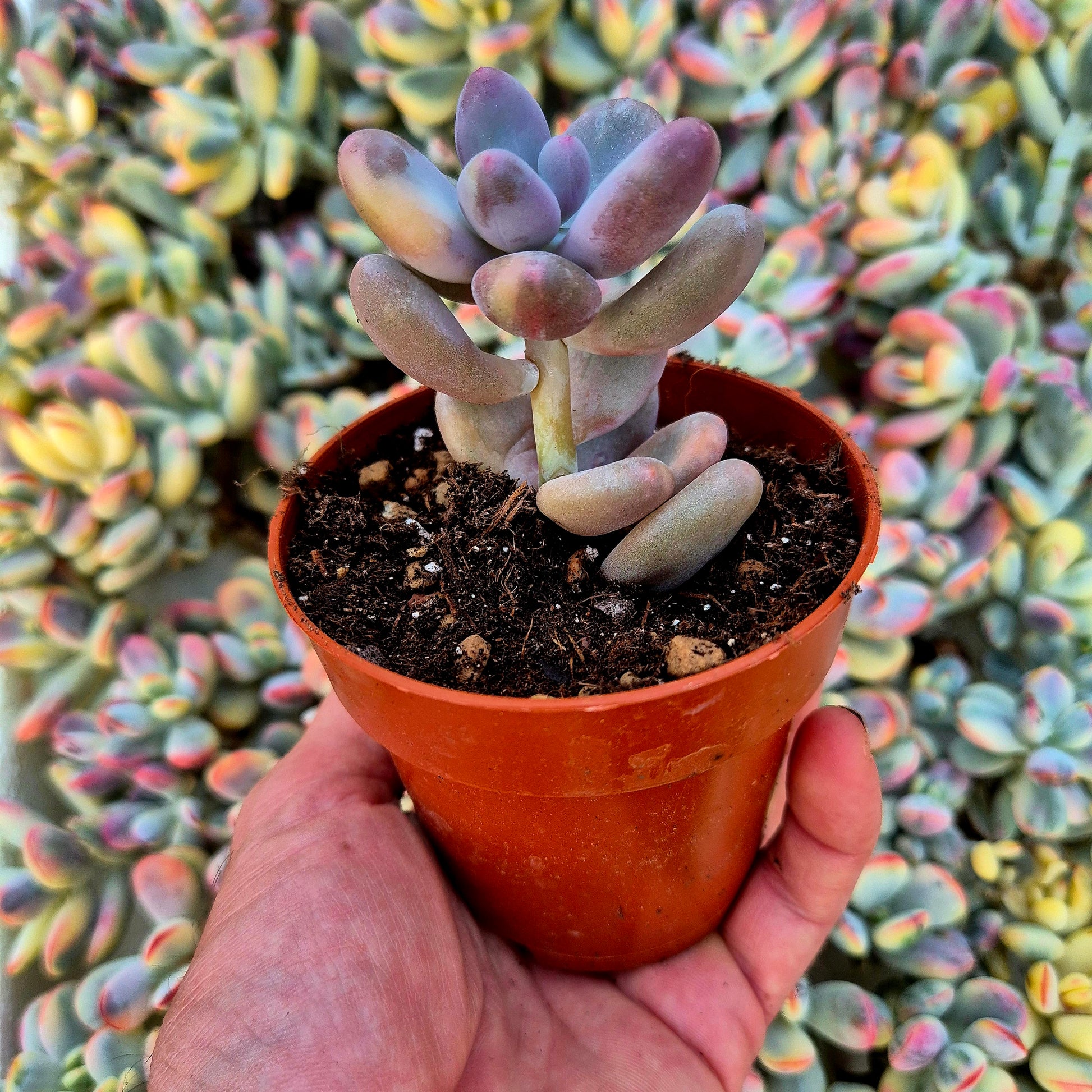 En la Pachyphytum oviferum variegada, la base verde azulada se combina con sectores crema y matices rosados que se intensifican con buena iluminación. La variegación aparece de forma irregular y natural, respetando la esencia botánica de la especie original pero elevando su valor estético. Es una pieza especialmente apreciada por coleccionistas que buscan formas puras y auténticas dentro del mundo de las suculentas variegadas, manteniendo ese equilibrio entre rareza y elegancia que tanto caracteriza a este género.